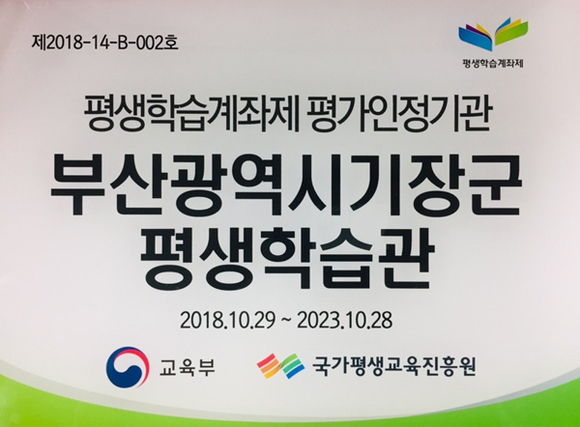 부산 기장군은 교육부와 국가평생교육진흥원에서 실시한 제14차 평생학습계좌제 학습과정 평가인정에서 지난 10월 '평생학습계좌제 기관단위 평가인정'을 획득하고, 지난 11일 국가평생교육진흥원으로부터 현판을 수여받았다고 14일 밝혔다.