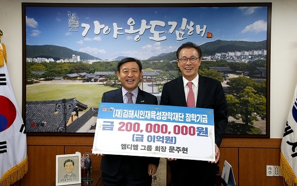 (재)김해시인재육성장학재단은 20일 엠디엠그룹 문주현 회장으로부터 장학기금 2억원을 전달받았다고 밝혔다.