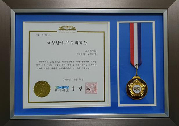김 의원은 "처음 교육위 국정감사를 치르면서 부족한 부분이 많았음에도 불구하고 3년 연속 당으로부터 우수 의원상을 수상해 뜻 깊게 생각한다"며 "교육위 위원으로서 보다나은 교육환경, 미래의 인재를 양성하기 위한 토대를 마련하는 일에 끊임없이 노력하겠다"고 말했다.