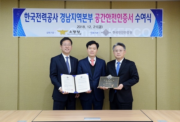 한국전력공사 경남지역본부는 21일 한국안전인증원의 '공간안전인증'을 획득했다고 밝혔다.