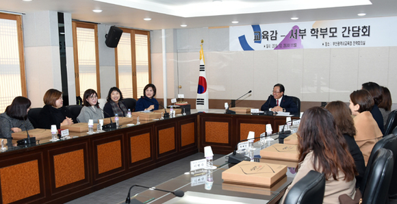 김석준 부산시교육감이 26일 낮 12시 시교육청 전략회의실에서 서부교육지원청 관내 학교운영위원회와 학부모회 임원진 13명과 도시락 간담회를 열고 부산교육 현안에 대해 의견을 나누고 있다. (사진=부산시교육청 제공)