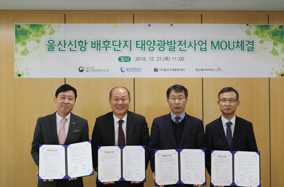 울산항만공사(UPA)는 지난 27일 울산지방해양수산청, ㈜울산국제물류센터와 영남에너지서비스㈜와 '울산 신항 배후단지 태양광발전사업 추진을 위한 상호 업무협력 협약(MOU)'을 체결했다고 밝혔다.