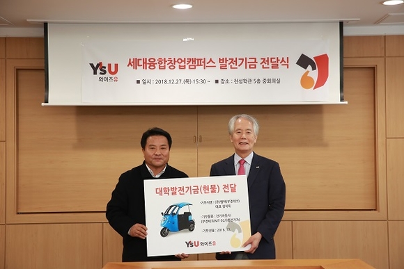 ㈜엠텍 김치옥 대표가 지난 27일 와이즈유(영산대) 양산캠퍼스를 방문해 전기자동차를 기증했다. 친환경 전기차를 제작하고 있는 엠텍은 와이즈유 세대융합캠퍼스사업단에서 육성하고 있는 신생 창업기업이다.