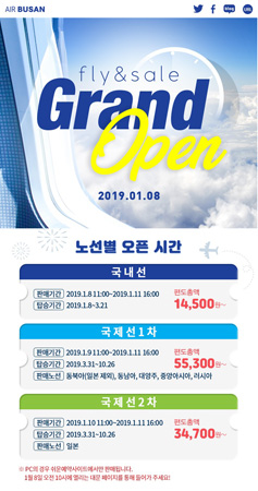 이번 FLY&SALE은 에어부산이 취항하는 국내선 7개, 국제선 29개 전 노선을 대상으로 실시된다. 국내선과 국제선 1차(중국/동남아/기타 지역), 국제선 2차(일본)로 나뉘어 진행된다.