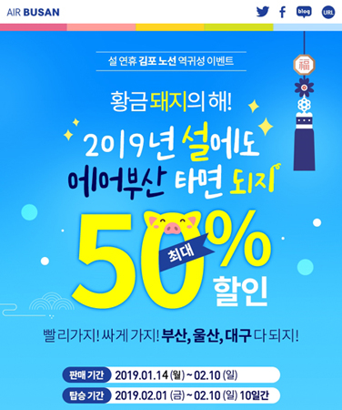 설 연휴 기간 최대 50%까지 할인을 실시하는 역귀성편 항공권은 오는 14일부터 다음 달 10일까지 에어부산 홈페이지와 모바일 앱에서 구매할 수 있다.