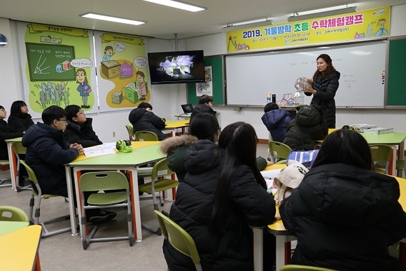 이번 체험 수학캠프는 초등학교에서 중학교로 올라가면서 발생할 수 있는 수학적 어려움을 최소화하고, 수학적 역량을 키우기 위한 체험·탐구 중심의 프로그램을 통해 쉽고 재미있게 수학을 학습할 수 있도록 했다.