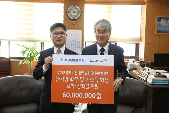월드비전 경남지역본부는 9일 '글로벌 희망나눔캠페인' 성금 6천만원을 경남도교육청에 기탁했다.