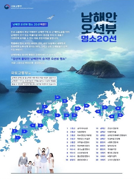 '남해안 오션뷰 명소 20선'은 경남 거제에서 전남 고흥까지 펼쳐진 수려한 남해안 조망지 중 특히 뛰어난 풍광을 자랑하는 조망지점 20곳을 소개하고 있다. 경남 거제의 구조라 해변에서 시작해 통영 국제음악당 해상데크, 달아공원을 지나 남해 관음포 첨망대를 거쳐 전남 고흥까지 이어지는 남해안 오션뷰를 사진과 여행 스토리를 함께 담아내어 도민에게 새로운 정보를 제공하고 있다.