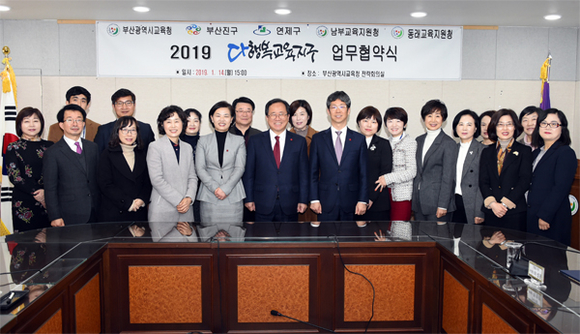 김석준 부산시교육감이 14일 오후 3시 시교육청 전략회의실에서 서은숙 부산진구청장, 이성문 연제구청장과 '2019 다행복교육지구 운영'을 위한 업무협약을 체결하고 관계자들과 기념촬영을 하고 있다. (사진=부산시교육청 제공)