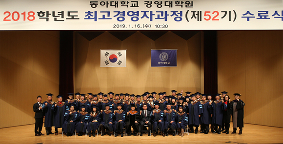 한 총장은 이날 수료식에서 "동아대 경영대학원 최고경영자과정이 사회 각계각층에서 중요한 역할을 담당하는 선배 동문들과 유대관계를 형성할 수 있는 좋은 기회가 됐길 바란다"며 "경제적으로 어려운 시기지만 그동안 갈고 닦은 학문적 소양을 바탕으로 탁월한 리더십과 역량을 발휘해 성공적인 미래로 나아가길 기원한다"고 말했다.