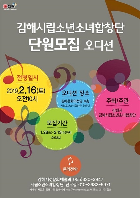 모집 부문은 소프라노, 메조소프라노, 알토이며, 원서 접수는 오는 28일부터 2월 13일까지 시청 문화예술과 예술팀으로 하면 된다. 실기와 면접 전형을 거친 뒤 내달 19일 김해시청 홈페이지 공고고시란에서 최종 합격자를 발표할 예정이다.