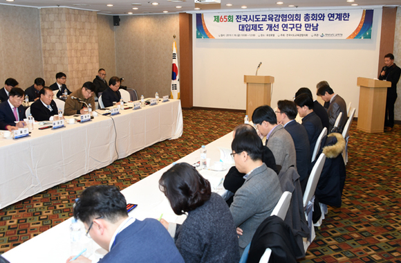 김석준 부산시교육감이 18일 오전 10시 대전시 유성호텔에서 열린 전국시도교육감협의회 총회에 참석, '대입제도 개선 연구단'과 대입제도 개선 방향에 대해 의견을 나누고 있다. (사진=부산시교육청 제공)