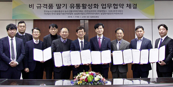 한국농수산식품유통공사(aT) 사이버거래소는 지난 17일 서울 aT센터에서 수출용 못난이 딸기 유통활성화를 위한 유명프랜차이즈업체와 딸기생산자단체 간 업무협약을 체결했다고 18일 밝혔다.