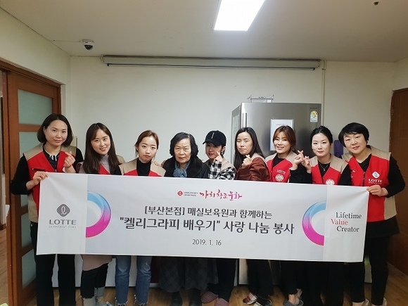 롯데백화점 부산본점 샤롯데 봉사단은 지난 16일 부산진구 소재 매실보육원을 방문해 켈리그라피 체험 재능 기부 및 점심 제공 사회공헌 활동을 실시했다. (사진=롯데쇼핑 제공)