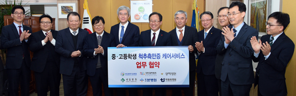 김석준 부산시교육감이 22일 오전 11시 교육감실에서 김동헌 대한결핵협회 부산지회장, 이광웅 광혜병원장, 전철우 세일병원장, 하상훈 부산본병원장, 박원욱 박원욱병원장 등과 '중·고등학생 척추측만증 케어서비스' 업무협약을 체결하고 있다. (사진=부산시교육청 제공)