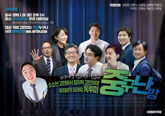 더불어민주당 70년대생 국회의원 모임(국회의원 강병원, 강훈식, 김병관, 김해영, 박용진, 박주민, 이재정, 전재수, 제윤경)은 공동으로 오는 26일 오후 2시, 부산대학교 본관 3층 대회의실에서 <톡투미 '중구난방'-부산편>을 개최한다고 24일 밝혔다.