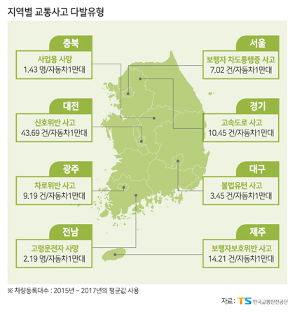 한국교통안전공단이 지난 2015년부터 2017년까지 3년간 약 67만 건의 교통사고를 분석한 '전국 시도별 교통사고 다발유형'을 29일 발표했다.