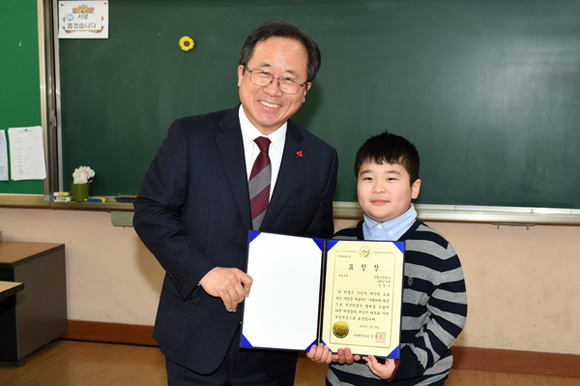 김석준 부산시교육감은 이날 오전 10시35분께 부산 사하구 장림초등학교 4학년 2반 교실을 찾아 유창복 학생에게 교육감 표창장(모범학생상)을 수여하고 선행을 격려했다.