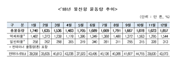 지난해 물동량은 상반기 정유사 정기보수와 조선업 경기불황으로 상승세에 난항을 겪었다. 하반기에는 국제유가의 하락, 철강쿼터제등 외부환경의 영향으로전년 실적을 경신하지 못할 것으로 예측됐다.