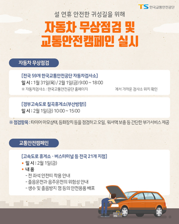 한국교통안전공단은 설 연휴 기간 국민의 안전한 귀성길을 위해 자동차 무상점검 및 교통안전캠페인을 실시한다고 30일 밝혔다.