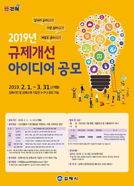 경남 김해시는 내달부터 '2019년 규제개선 아이디어 공모전'을 개최한다고 30일 밝혔다.
