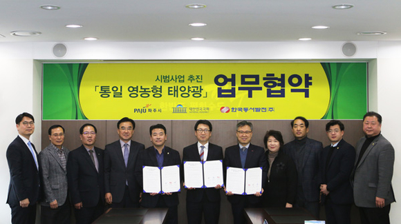 한국동서발전은 1일 파주시청에서 최종환 파주시장, 더불어민주당 박정 국회의원이 참석한 가운데 '통일 영농형 태양광'시범사업 협약을 체결했다.