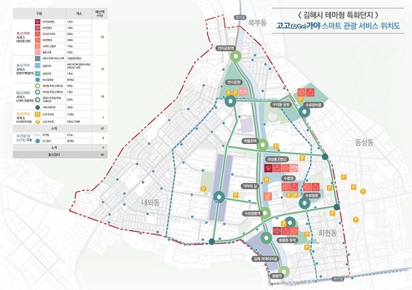 김해시는 '보고, 느끼고, 걷고 싶은 스마트 관광도시 김해' 비전을 목표로 체감형 관광 콘텐츠 구축과 관광객 이동편의를 위한 스마트 모빌리티 서비스 제공으로 새로운 지역 관광산업을 발굴하는 '고고(古GO)가야 스마트 관광 서비스'를 조성해 관광객을 유치할 계획이다.