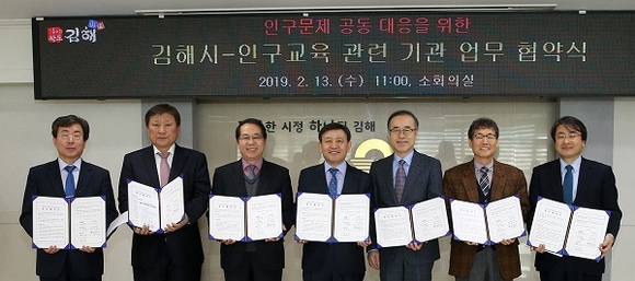 시는 13일 시청 소회의실에서 인제대(김성수 총장), 가야대(이상희 총장), 부산장신대(천병석 기획정보처장), 김해대(편금식 총장) 등 4개 대학, 김해교육지원청(박종대 국장), 인구보건복지협회 경남지회(조우성 회장) 등 6개 유관기관과 기관별 특성에 맞는 인구교육 확대를 위한 협약식을 가졌다.