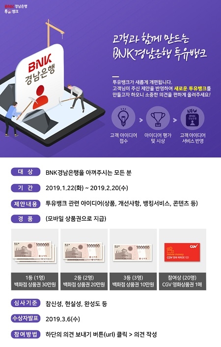 참여(제안)방법은 경남은행 홈페이지와 투유뱅크(개인)앱에서 진행중인 이벤트 코너 '고객과 함께 만드는 BNK경남은행 투유뱅크 이벤트'를 방문한 뒤 의견을 작성하면 된다.
