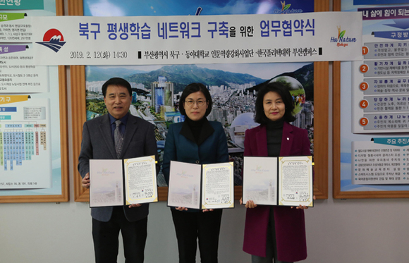 부산 북구는 지난 12일 동아대학교 인문역량강화사업단, 한국폴리텍대학 부산캠퍼스와 함께 평생교육 네트워크 구축을 위한 관·학 업무협약(MOU)을 체결했다고 15일 밝혔다.