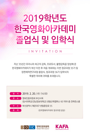 영화진흥위원회 한국영화아카데미는 오는 20일 14시 부산 본사 지하1층 컨퍼런스룸에서 '2019학년도 한국영화아카데미 35기 정규과정 및 장편제작연구과정 졸업식과 36기 정규과정 입학식'을 개최한다고 15일 밝혔다.