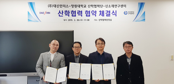 이번 산학협약은 창원대 신소재연구센터가 지난해 ㈜대신인더스에 천연고무와 혼합이 가능한 난연재 소재 기술이전을 한 데 이어 다양한 혼합소재 개발을 위한 공동 R&D 및 기술이전, R&D 인력양성 등을 추진하기 위해 마련됐다.