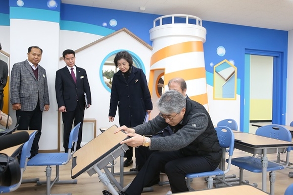 또한 놀이와 배움이 함께하는 공간과 창의성을 자극하는 색채디자인이 적용된 초등학교 1학년 공간혁신 교실의 구축 현황을 확인하고, “학생들의 상상력이 자라서 넓은 바다가 되는 교실(상상의 바다 교실)”이라며 만족감을 표했다.