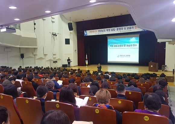 경남도교육청은 25일부터 4월 5일까지 마산종합운동장, 늘푸른전당 등에서 도내 학원 및 교습소 설립·운영자 8346명이 참가하는 2019년도 학원 및 교습소 설립·운영자 연수를 실시한다.