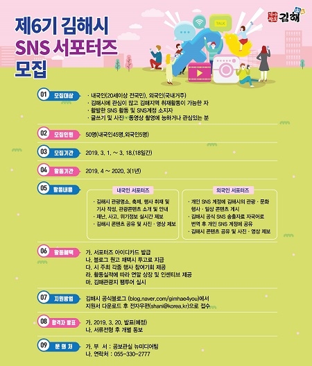 경남 김해시는 1일 SNS를 통해 시정참여의 기회를 확대하고 시민과의 소통을 활성화 하고자 제6기 SNS서포터즈를 모집한다고 밝혔다.