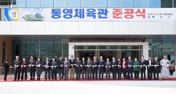 경남 통영시는 지난 28일 평림생활체육공원에 건립한 통영체육관 준공식을 개최했다.