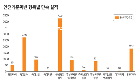 항목별로는 안전기준위반이 79.7%로 가장 많았으며, 불법튜닝(12.5%), 번호판 위반 등(6.8%)의 순이다.