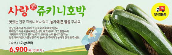 오는 5일부터 우체국쇼핑몰을 비롯해 G마켓, 11번가, 카카오, 티몬 등 온라인쇼핑몰 프로모션 기획행사를 통해 쥬키니호박 1.7kg를 6,900원의 저렴한 가격으로 판매한다.