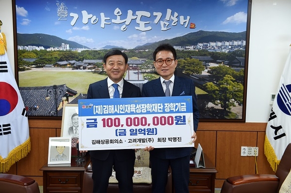 (재)김해시인재육성장학재단은 5일 현 김해상공회의소 12대 회장인 고려개발(주) 박명진 회장으로부터 장학기금 1억원을 전달받았다고 밝혔다.