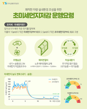 한국교통안전공단은 미세먼지(PM10) 및 초미세먼지농도(PM2.5)가 높은 봄 철, 쾌적한 차 실내환경 유지하기 위한 차량 운행 시 공조 모드별 미세먼지저감 측정결과를 8일 발표했다.