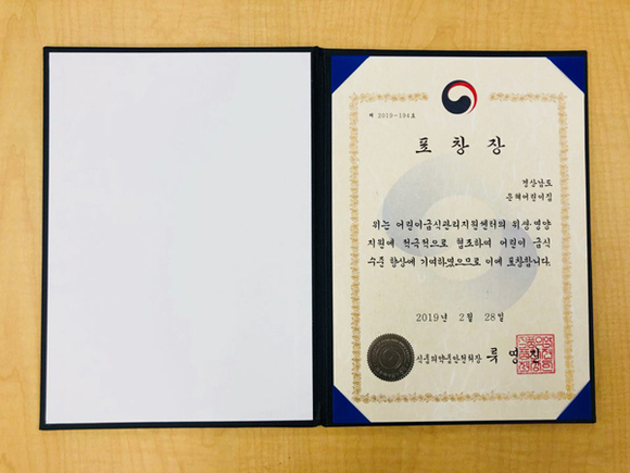어린이급식관리지원센터에 따르면 이번 시상에서는 은혜어린이집을 비롯해 2018년 한 해 동안 센터의 어린이 급식소 영양·위생·안전 관리 및 원장·조리원 대상 교육 등을 성실히 수행해 관내 어린이 급식소 수준 향상에 크게 기여한 전국 18개소 어린이집이 '식품의약품안전처장상'을 수상했다.