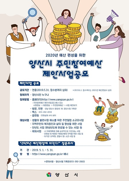 경남 양산시는 주민참여예산제에 따른 2020년 주민제안사업을 오는 5월 31일까지 공모한다고 15일 밝혔다.