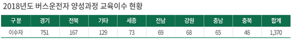 특히, 1,370명의 교육 이수자 중 57.5%인 788명이 취업을 완료했는데, 시내·시외버스가 529명(67.1%)으로 가장 취업자가 많았고, 마을버스 181명(23%), 전세버스 78명(9.9%) 순으로 많았다.