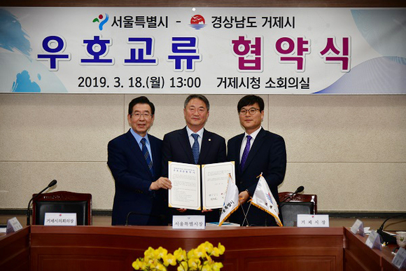 변광용 거제시장은 18일 거제시청 소회의실에서 박원순 서울시장과 '경상남도 거제시-서울특별시 우호교류협약'을 체결했다.