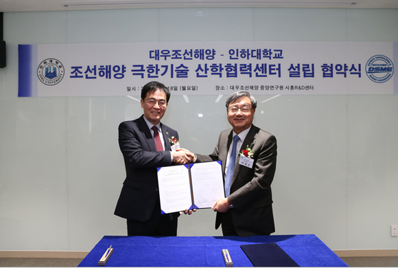 대우조선해양과 인하대는 지난 18일 대우조선해양 시흥R&D센터에서 '조선해양 극한기술 산학협력 연구센터'설립에 대한 협약식을 가졌다고 19일 밝혔다.