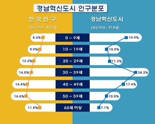 경남혁신도시의 연령대별 인구분포를 보면, 30대가 24.3%로 가장 많았으며, 그다음으로 0~9세 인구가 19.9%로 나타났다. 그리고 주민등록인구의 평균연령은 37세로 전국 평균연령 42세에 비해 매우 젊은 것으로 나타났다.
