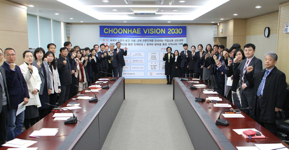 또한, CHOONHAE VISION 2030의 배경과 의미, 3대 핵심전략인 대학 인프라의 혁신ㆍ인재양성의 혁신ㆍ협력역량의 혁신, 6대 발전영역인 인프라ㆍ대학경영ㆍ직업교육ㆍ취업ㆍ산학협력ㆍ평생학습을 설명하고 구성원들의 새로운 도전과 혁신, 그리고 소통 기반의 조직문화 형성을 강조했다.