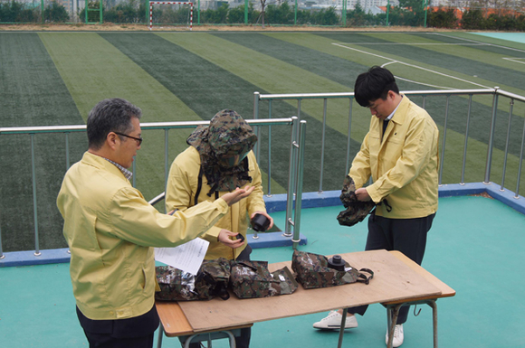 대피 이후에는 대형화재 사고대비 국민행동요령 교육, 화재현장에서의 대처방법, 방독면 사용법 등을 실습·체험하는 방식으로 진행됐다.