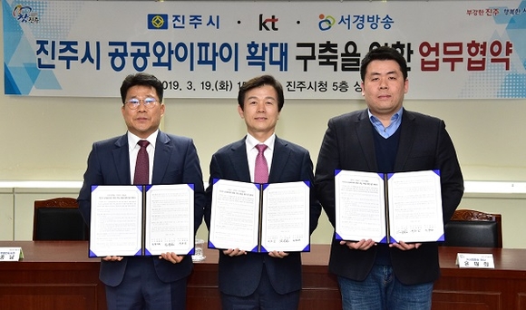 경남 진주시는 19일 시청 5층 상황실에서 KT, 서경방송과 공공와이파이 확대 구축을 위한 업무협약식을 가졌다.