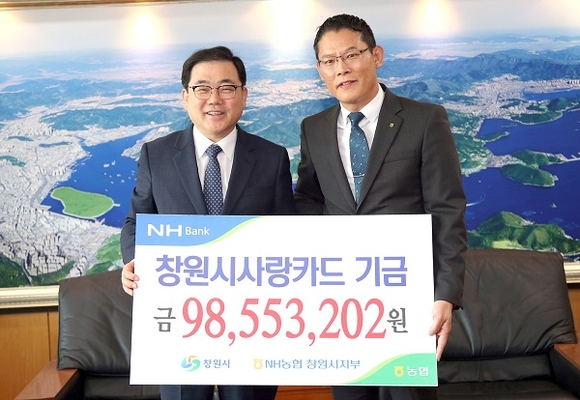 경남 창원시는 19일 농협은행 창원시지부가 제휴카드인 '창원시사랑카드' 적립금 9800만원을 허성무 창원시장에게 전달했다고 20일 밝혔다.